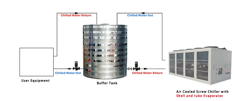 A léghűtéses csavarhűtőhöz a hűtő nagy hatékonyságú héjjal és cső párologtatóval van, víztartály és vízszivattyú nélkül a hűtő belsejében, tehát csatlakoztatni kell a puffertartályt és a szivattyút kívülről, kérjük, olvassa el a Flow Connection rajzot referenciaként: