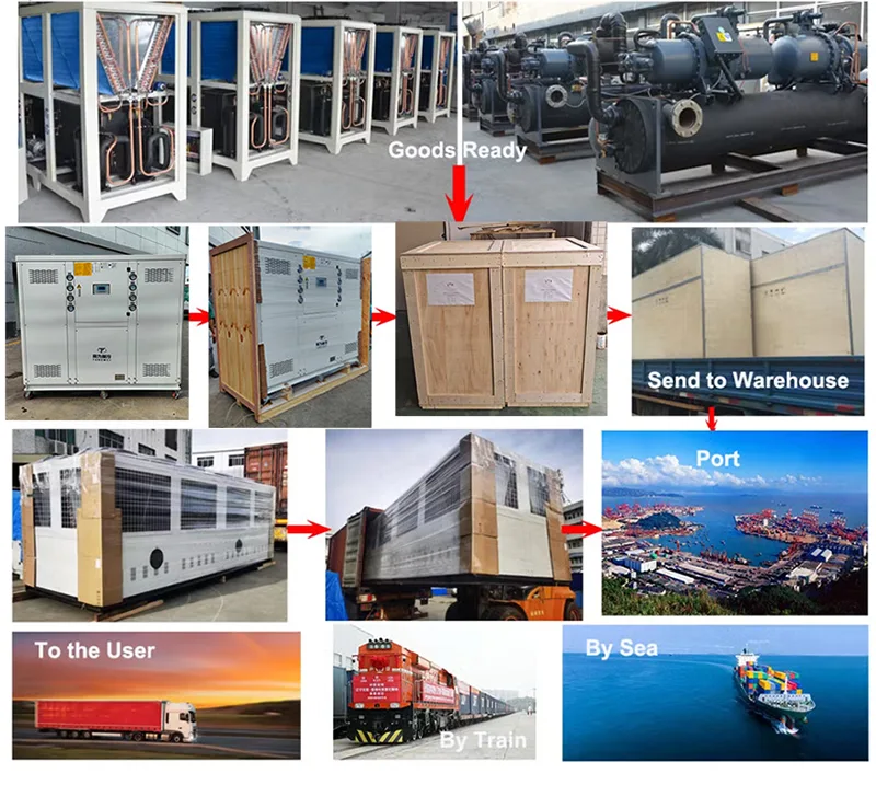 Professzionális vízhűtő beszállítóként és exportőrként saját szállítmányozóval rendelkezünk a szállítás megszervezésére. Hűtőgépünk rétegelt lemez csomagolású, amely megakadályozza a szállítás során a sérüléseket, és megfelel az exportszabványoknak. Háromféleképpen szállíthatja a hűtőegységet: